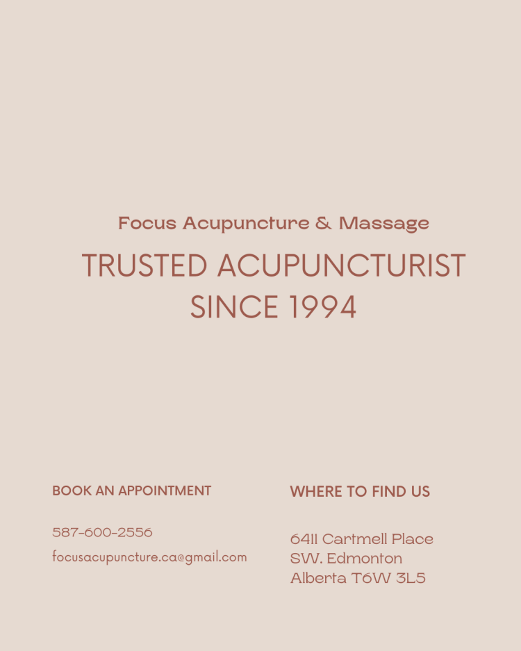 Dear clients, to book an appointment, please call (587)-600-2556 or send us an email at focusacupuncture.ca@gmail.com and we will respond ASAP. Thank you.